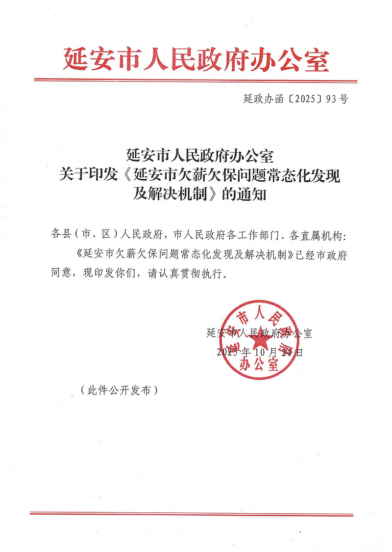 延安市人民政府办公室关于印发《延安市欠薪欠保问题常态化发现及解决机制》的通知
